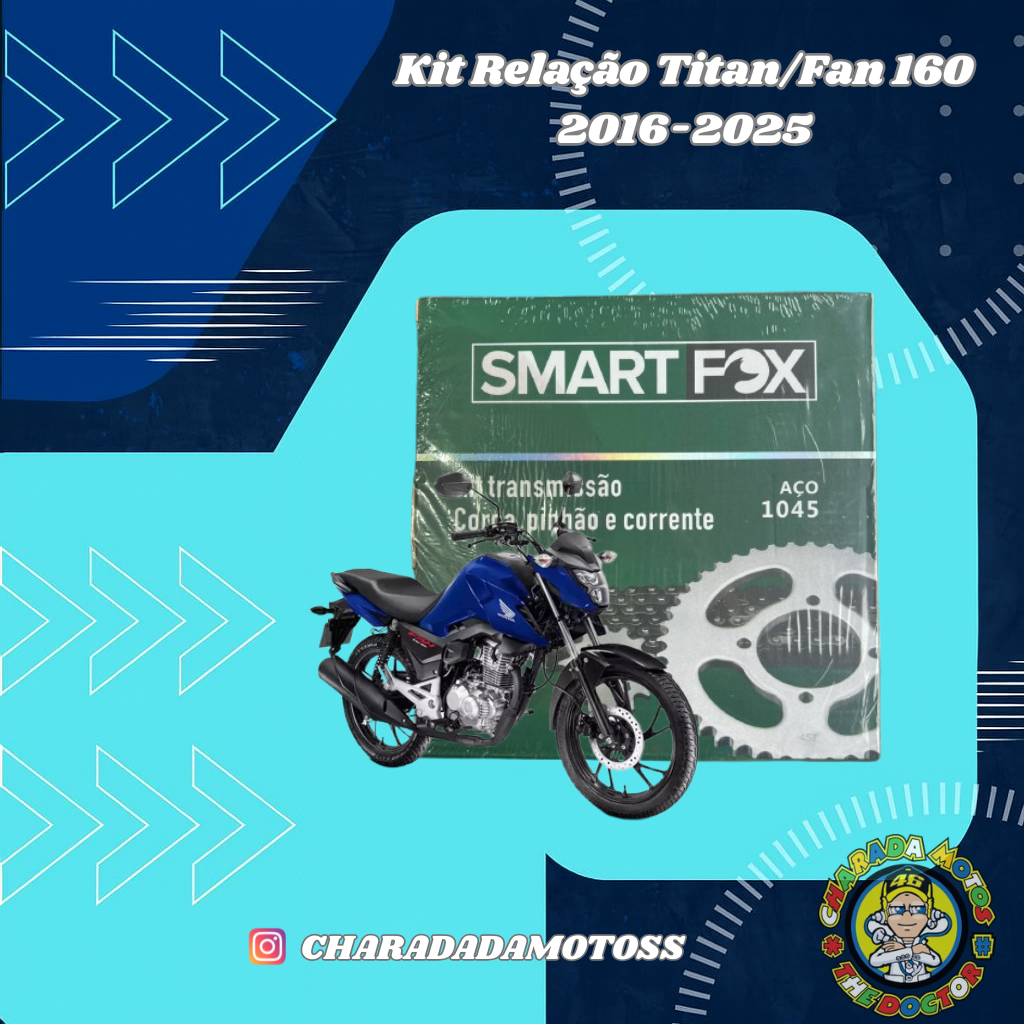 Kit de transmissão original SmartFox para motocicletas Titan e Fan 160 fabricadas entre 2016 e 2025, garantindo desempenho e durabilidade na sua moto.